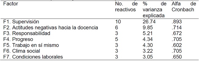 Posteriormente, se aplicó un análisis factorial de componentes principales con rotación ortogonal varimax para obtener la validez de constructo de la escala. Como resultado, se eliminaron siete reactivos y se obtuvieron siete factores con 33 reactivos que explican 56.73% de la varianza total y un alfa de Cronbach total de .910; esto se muestra en las tablas 2 y 3. La matriz de correlaciones resultó adecuada, según lo muestran la medida de adecuación muestral de Kaiser, Meyer y Olkin (KMO = .903) y la prueba de esfericidad de Barttlet (X2=4844.77, p=.000). Se observa que las áreas con mejor conformación fueron Supervisión y Actitudes negativas hacia la docencia, mientras que las menos consistentes fueron Trabajo en sí mismo, Condiciones laborales y Responsabilidad (ver Tabla 2).