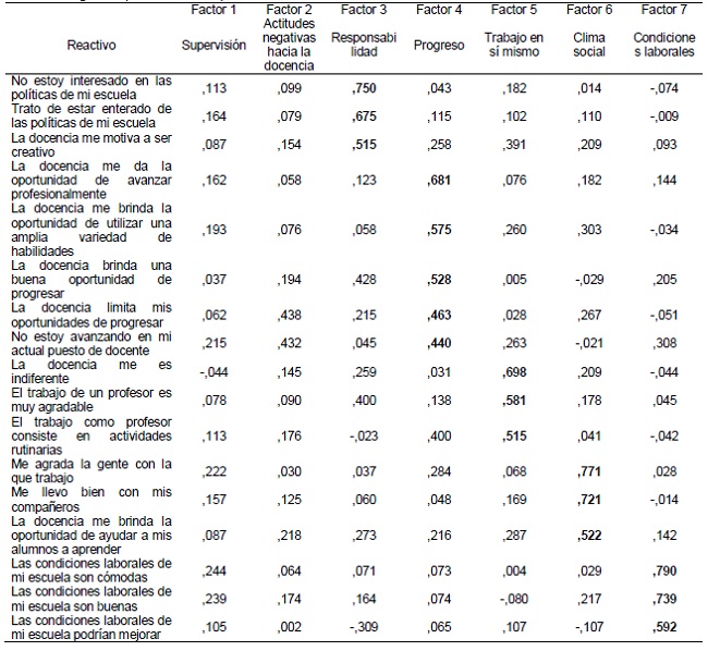 El séptimo factor Condiciones laborales agrupa tres reactivos que recogen la percepción de los profesores en cuanto a las características de su entorno laboral y satisfacción con el mismo. Estos resultados se pueden observar en la Tabla 3.