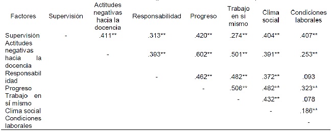 Por otra parte, Seguridad y Reconocimiento, que integraron los reactivos sobre satisfacción con el entorno laboral y las características físicas de éste, tuvo las correlaciones más importantes con Supervisión y Progreso, y las más débil con Trabajo en sí mismo, lo que denota la independencia entre las condiciones laborales y la satisfacción con la actividad docente.
