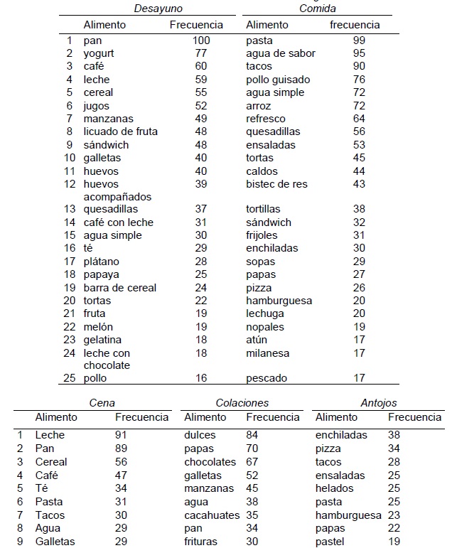 Se acudió a una universidad pública del Distrito Federal y se le pidió a un grupo de alumnos que hicieran una lista de los alimentos sólidos y líquidos que habían consumido en cada una de las categorías durante la última semana.