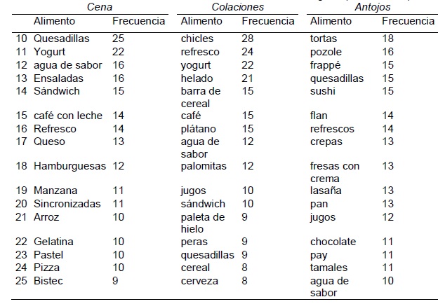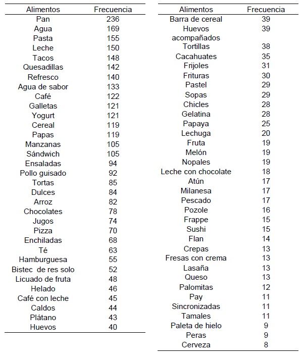 En el presente estudio, se identificaron los alimentos consumidos con mayor frecuencia por estudiantes universitarios así como las emociones experimentadas durante el consumo de cada uno de ellos.