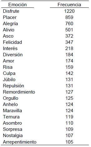 En el paquete estadístico SPSS se capturaron las emociones que los participantes asignaron a cada uno de los alimentos, así como la intensidad experimentada. Las emociones reportadas con mayor frecuencia, independientemente del alimento fueron: alegría, alivio, amor, arrepentimiento, asco, culpa, disfrute, felicidad, placer, remordimiento, repulsión y ternura.