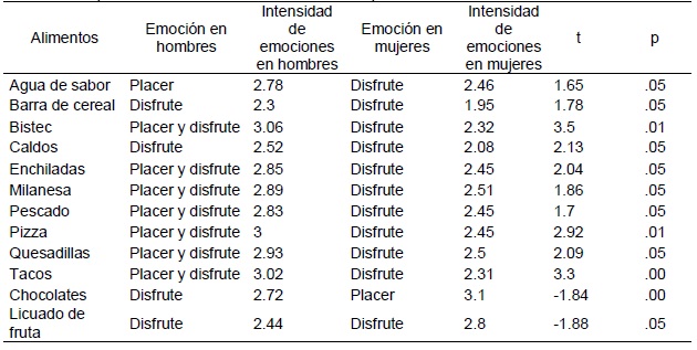 Como se observa en la tabla 4, los hombres experimentaron emociones agradables y mayor intensidad de las mismas durante el consumo de agua de sabor, barra de cereal, bistec, caldos, enchiladas, milanesa, pescado, pizza, quesadillas y tacos. Las mujeres experimentaron emociones agradables y mayor intensidad de las mismas que los hombres durante el consumo de chocolates y licuado de fruta.
