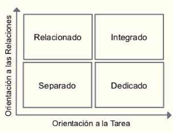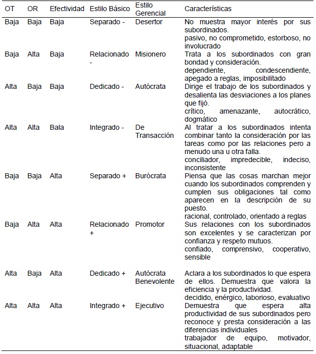 El estilo de quienes poseen poca OT y OR se denominan Separado y se apegarán a las normas y a las reglas como estrategia para lograr sus objetivos; el estilo con alta OR pero baja OT es Relacionado, son personas que buscaran respaldar a los individuos confiando en sus atributos personales; quien posee alta OT y baja OR es Dedicado y son personas que concentran sus esfuerzos en completar las actividades y el conocimiento de las mismas; finalmente aquellos con alta OT y OR son del tipo Integrado y se concentran en que la tarea se logre de forma colaborativa aprovechando las habilidades de los miembros del equipo (Reddin, 1989, 1990;emsp Serralde, 2001).