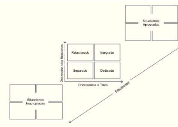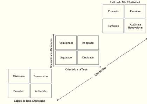 William J. Reddin propuso en su tesis doctoral un modelo para explicar la eficacia de las personas para lograr resultados en posiciones gerenciales (Reddin, 1983). Este modelo se concentraba en la combinación de tres elementos: la orientación a la tarea (OT), se define como la tendencia de los individuos a orientar sus esfuerzos hacia las actividades o responsabilidades asignadas, es decir, iniciar, organizar, y dirigir las tareas; la Orientación hacia las Relaciones (OR), es la forma en la cual el individuo dirige sus esfuerzos a tener relaciones de trabajo personales, se caracteriza por escuchar, confiar y alentar; y la Efectividad (E) que es el grado en el cual el comportamiento se percibe como apropiado para los requerimientos de la situación. De ahí que Reddin denomino a su modelos la Teoría 3D, en la Figura 1 es posible observar el modelo; este modelo indica cómo adaptar el comportamiento a las situaciones para lograr los objetivos requeridos por la institución.