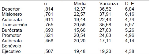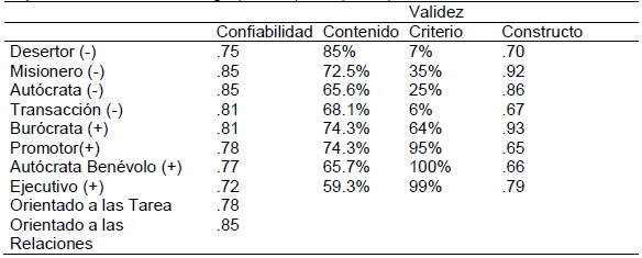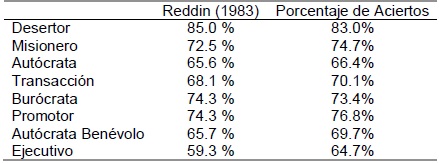 Se consideró importante de todos modos realizar los análisis desarrollados por William J. Reddin (1983), para ello decidió aplicarse en formato de lápiz y papel el test a una muestra de gerentes para replicar el estudio original. Así, en el análisis de confiabilidad alpha de Cronbach nuevamente los índices fueron adecuados para una prueba únicamente siendo bajos en los estilos Autócrata Benévolo y Ejecutivo, quizás debido a que la frecuencia en estos casos también es baja pero debe de considerarse en estudios futuros.
