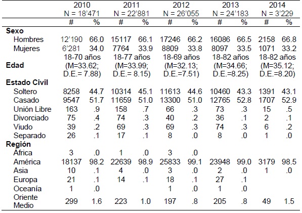 Para cumplir el primer objetivo de investigación se utilizó la población de la Base de Datos histórica de evaluados de los Diagnósticos de Efectividad Gerencial de Reddin Consultants del 1 enero de 2010 al 26 de febrero de 2014; se corroboró que en cada uno de los casos seleccionado los participantes hubieran aceptado compartir su información de forma voluntaria y anónima para fines de investigación. De la información obtenida se realizó una selección no probabilística intencional para eliminar los casos repetidos, pruebas, que fueran casos extremos o que carecieran de información demográfica de: sexo, edad, lugar de residencia y estado civil. Estos casos se analizaron segmentados por cada año (2010 a 2014); las características de la muestra se pueden observar en la Tabla 3.