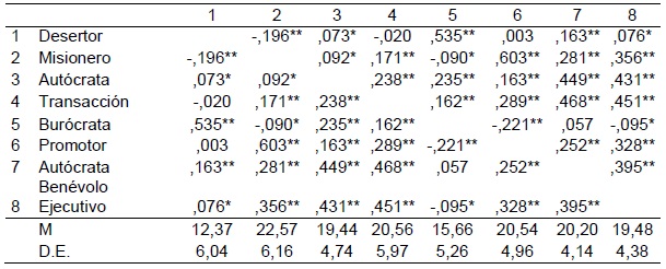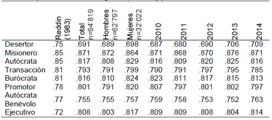 Los índices de confiabilidad en cada año considerado, demuestran que el test cumple con los criterios adecuados de confiabilidad y consistencia interna. Sin embargo, es posible considerar que los análisis fueron realizados con grandes y que es posible que la significancia de los datos esté vinculada a los grandes tamaños de la muestra. Otra consideración fue que estos cuestionarios se aplicaron como parte de un proceso interno en organizaciones que estaban vinculados al desarrollo profesional de los participantes. Por ello se decidió realizar los análisis de confiabilidad con una muestra similar a la originalmente empleada por el autor (970) y en condiciones similares (aplicación en papel) y se requirió de una muestra que ayudará al logro del segundo objetivo de investigación. En la Tabla 5 es posible observar los índices de confiabilidad obtenidos por factor de la escala junto con sus descriptivos. Es notable que todos los factores poseen índices de alpha de Cronbach aceptables y similares a los obtenidos previamente, aunque en este caso la frecuencia de los estilos Burócrata y Ejecutivo fue menor en esta muestra lo cual puede relacionarse con un menor alpha.