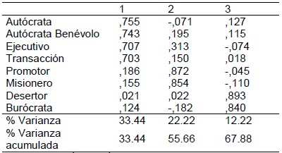 Considerando estos resultados se procedió a replicar el análisis factorial, en el estudio original Reddin (1983) indico que se había preferido que la configuración el test surgiera del modelo teórico más que de un modelo matemático, sin dejar de considerar la importancia y robustez que una configuración factorial ofrecía. Así se replicó inicialmente el análisis factorial de componentes principales con rotación varimax, encontrándose 3 factores que en 5 interacciones explican el 67.88% de la varianza acumulada (ver Tabla 8). Esta configuración resulta más apropiada que la originalmente identificada por Reddin ya que se agrupan los factores por estilos básicos y no existe una carga de .5 en múltiples factores como se reportó originalmente.