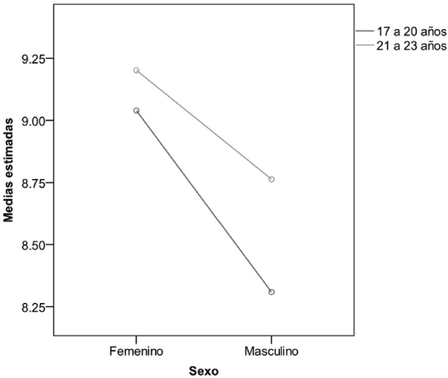 Se realizó una comparación por sexos y edad, para lo cual se formaron dos grupos etarios: el grupo de menor edad quedó conformado por aquellos entre 17 y 20 años (n = 218), y los de mayor edad con edades entre 21 y 23 (n = 189). Un ANOVA de 2 x 2 mostró únicamente diferencias entre sexos F(1, 403) = 4.116, p = .043, siendo que las mujeres (M = 9.12, D. E. = 2.73) puntuaron más alto que los hombres (M = 8.51, D. E. = 2.48) en depresión, pero no se encontraron diferencias significativas entre grupos etarios F(1, 403) = 1.144, p = .285, ni en la interacción F(3, 403) = .259, p = .611 (ver Figura 1).