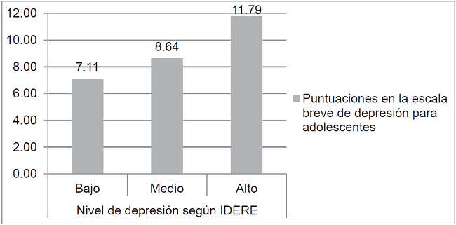 Finalmente, se llevó a cabo la validación por convergencia utilizando como parámetro las puntuaciones del IDERE. Una correlación de Pearson mostró una asociación de .809, p < .001 entre las puntuaciones de ambos instrumentos. Asimismo, se realizó un ANOVA para verificar que las puntuaciones obtenidas en el instrumento breve de depresión para adolescentes fueran significativamente diferentes para los niveles de depresión bajo (n = 167), medio (n = 121) y alto (n = 119), de acuerdo con los puntos de corte del IDERE, encontrándose diferencias significativas entre los tres grupos F(2, 404) = 230.505, p < .001, con pruebas post-hoc de Tukey (ver Figura 2).