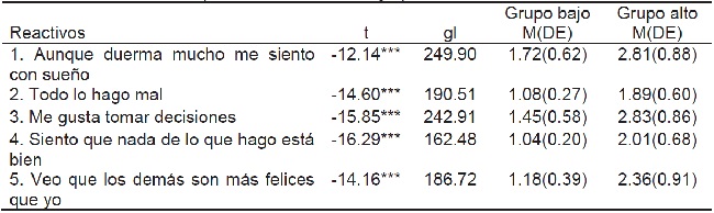 La comparación entre grupos extremos mostró diferencias significativas para cada uno de los reactivos del instrumento (ver Tabla 1).