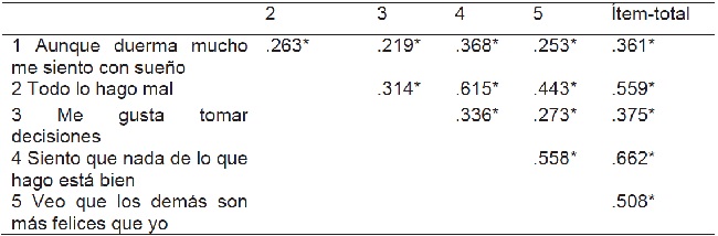 Para el desarrollo del instrumento, un grupo de expertos construyó un conjunto de reactivos que, tras la revisión estadística de los mismos, quedó conformado por cinco reactivos que evalúan confiablemente la depresión rasgo en adolescentes, y cuya validez quedó confirmada por la convergencia de sus puntuaciones con las de otro instrumento de depresión rasgo para población general desarrollado con anterioridad en población cubana (Ramírez et al., 1989; en Martín et al., 2003), y utilizado en diversas investigaciones (Martín et al., 2012; Martín-Carbonell et al., 2012).