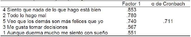 A continuación se realizó un análisis factorial exploratorio con la finalidad de verificar que los reactivos fueran unifactoriales. Se obtuvo un valor KMO = .768 y una prueba de esfericidad de Barttlett significativa (p < .001). Los cinco reactivos se agruparon en un solo factor que explicó el 50.15% de la varianza; cada reactivo con carga superior a .50. El análisis de consistencia interna para el instrumento fue adecuado, con un α = .711. En la Tabla 3 se muestra la matriz de componentes principales.
