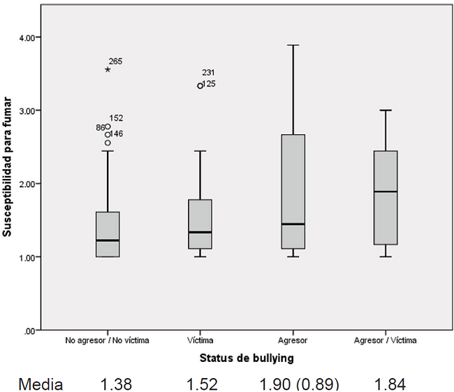 Al comparar la susceptibilidad para fumar entre las distintas categorías de bullying, se observó que los puntajes más altos y las mayores dispersiones correspondieron a los agresores y a los agresores/víctimas (véase figura 1), los cuales difirieron significativamente de los otros grupos, F(3,256) = 11.233, p<.001). Las comparaciones post hoc de Scheffé mostraron que los estudiantes que no estaban involucrados en el bullying (no víctimas / no agresores) diferían de los agresores (p<.001) y de los agresores/víctimas (p = .007), y las víctimas de los agresores (p = .032).