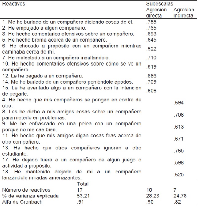 El análisis factorial de la Escala de Bullying-Agresión mostró dos factores que explicaron el 53.2% de la varianza (ver Tabla 1); el primero se refiere a la agresión directa de cualquier tipo, entendida como aquellos comportamientos que son desplegados directamente por el agresor, y el segundo señala la agresión indirecta, definida como la instigación a otros para que agredan a un tercero. Ambos factores correlacionaron significativamente. Se eliminó el reactivo 16. (“He amenazado a un compañero con herirlo o lastimarlo”) debido a que su carga factoriales fue <.40. El coeficiente alpha de Cronbach para la escala total fue de 0.91.