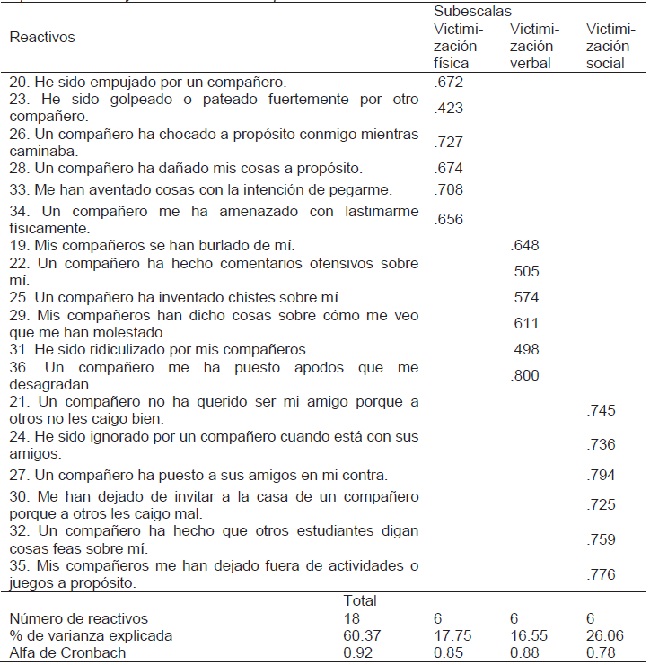 En cuanto a la Escala de Bullying-Victimización, el análisis arrojó tres factores (ver Tabla 2): el primero se refiere a la victimización física (golpes, empujones, choques intencionales); el segundo factor a la verbal (burlas, comentarios ofensivos, apodos), y el tercero a la social (ignorar, excluir, contraponer). La correlación entre el factor verbal y el social fue fuertemente significativa, más alta que la correlación entre el factor físico con cada una de ellos. El coeficiente alpha de esta escala fue de 0.92.