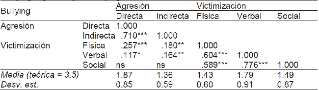 La correlación entre los puntajes de las subescalas de agresión directa e indirecta fue fuerte y positiva; las tres subescalas de victimización también correlacionaron significativamente. Las subescalas de agresión mostraron correlaciones débiles con las de victimización física y verbal, y no se relacionaron con la victimización social (ver Tabla 3). Las conductas de bullying de ambas escalas se situaron por debajo de la media teórica de 3.5; los puntajes de agresión directa fueron más altos que los de agresión indirecta; y en cuanto a la victimización, la verbal fue más alta, seguido por la social y, por último, la física.