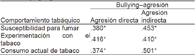 La susceptibilidad para fumar, la experimentación con el tabaco y el consumo actual de tabaco correlacionaron fuerte y positivamente con ambos tipos de agresión, en particular, el consumo con la agresión indirecta (véase tabla 4). Ninguna de las subescalas de bullying-victimización (física, verbal, social) resultó asociada con las variables de conducta tabáquica.