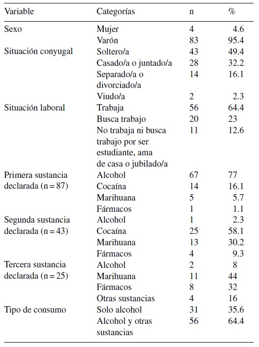 Se entrevistaron 87 pacientes en el Instituto Provincial de Alcoholismo y Drogadicción de Córdoba. La edad media de los pacientes fue de 37.4 años (DE = 12.5) años; los años de educación formal se calcularon con una media de 10.9 años (DE = 3.9).