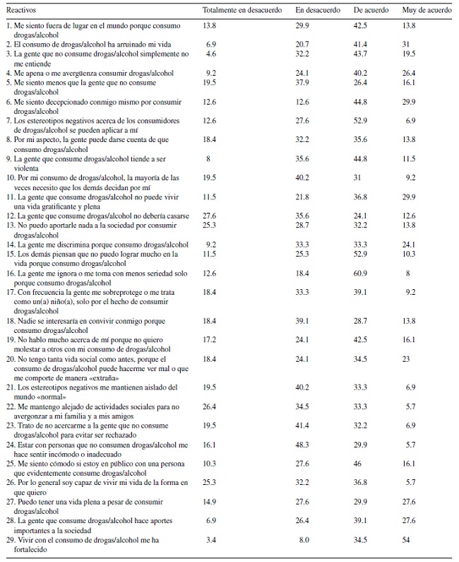 En la Tabla 2 se muestran los reactivos correspondientes a la dimensión «resistencia al estigma» (reactivos 25, 26, 27, 28 y 29); fueron calculados invirtiendo las puntuaciones, de acuerdo a la construcción original del instrumento.