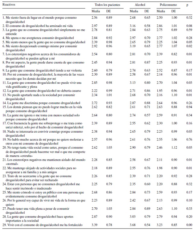 Resultados: En la muestra se identificaron puntuaciones que indican un estigma internalizado moderado a severo en 17 de los 29 ítems de la escala. Además, se observaron mayores indicadores de estigma en pacientes que declararon consumir solo alcohol, que en los pacientes que declararon policonsumo.