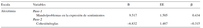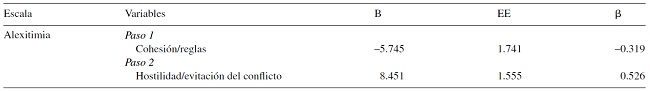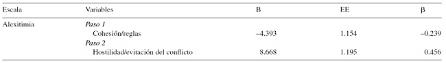 Para predecir la alexitimia en los 3 grupos de IMC —normopeso, sobrepeso y obesidad—, se llevaron a cabo 3 análisis de regresión lineal paso a paso. La variable dependiente fue el puntaje total de los 3 factores de alexitimia: dificultad para identificar sentimientos, dificultad para expresar sentimientos, y pensamiento externamente orientado; las variables independientes fueron los factores de la Escala de Funcionamiento Familiar: ambiente familiar positivo, hostilidad/evitación del conflicto, mando/problemas en la expresión de sentimientos, y cohesión/reglas. Para los normopeso, en la Tabla 1 se muestran los coeficientes de regresión no estandarizados (B), los estandarizados (β), el error (EE) y el coeficiente de determinación (R2).