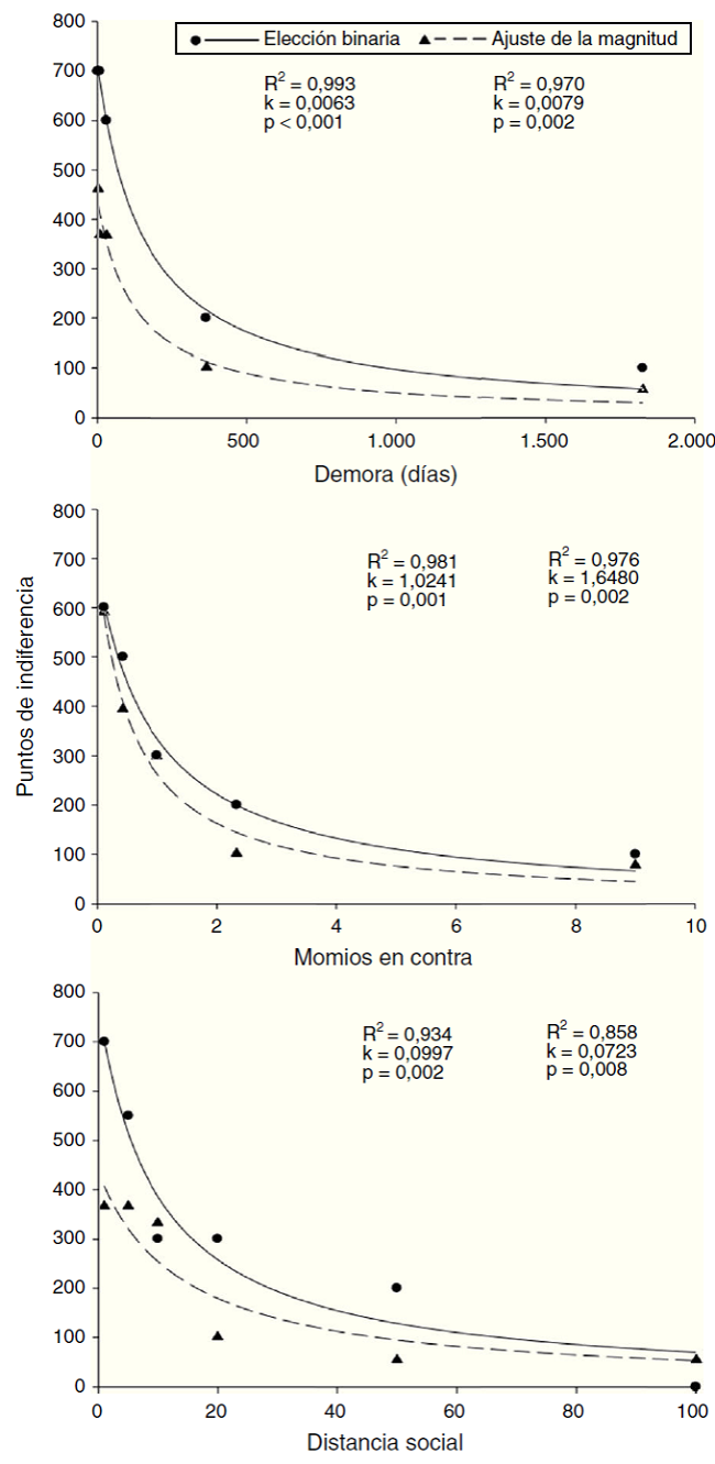 donde y es el valor subjetivo estimado de la recompensa, A es el valor real de la recompensa, X es la variable independiente (i.e., la demora, los momios en contra de la entrega de la recompensa1 o la distancia social) y el parámetro k representa la tasa de descuento del valor de la recompensa. Una tasa de descuento relativamente grande refleja conducta impulsiva, de aversión al riesgo o egoísta, según sea el caso. Por el contrario, una tasa de descuento relativamente pequeña indica mayor conducta autocontrolada, propensa al riesgo o altruista —cf. Green y Myerson (2004) para una revisión sobre descuento temporal y probabilístico, y Rachlin y Jones (2007) para una revisión sobre descuento social—.