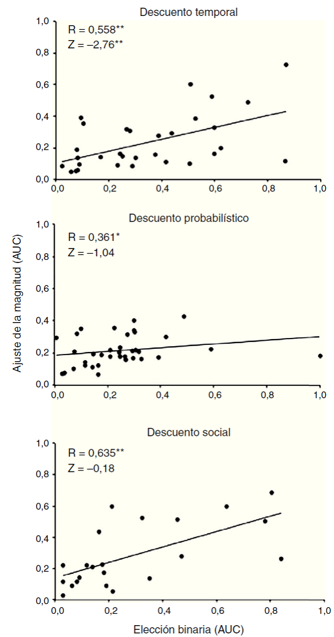 Después se obtuvieron las correlaciones Spearman entre los 3 tipos de descuento, con ambos métodos, de elección binaria y de ajuste de la magnitud. Con el método de elección binaria, se obtuvieron correlaciones entre los descuentos temporal y social, r = 0.439, p = 0.032, y entre los descuentos probabilístico y social, r = 0.548, p = 0.007, pero no entre los descuentos temporal y probabilístico, r = 0.019, p = 0.915. Por otra parte, con el método de ajuste de la magnitud se encontró lo contrario: se obtuvo una correlación entre los descuentos temporal y probabilístico, r = 0.365, p = 0.024, pero no entre los descuentos temporal y social, r = 0.313, p = 0.053, ni entre los descuentos probabilístico y social, r = 0.183, p = 0.264.