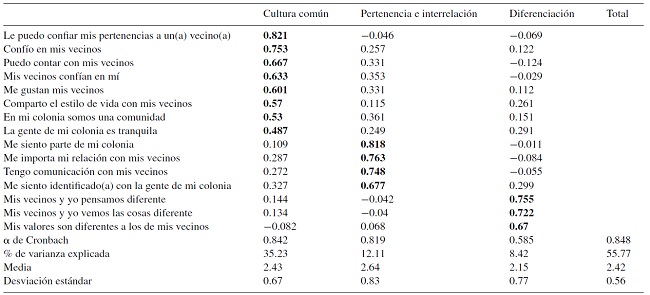 Se identificó que todas las opciones de respuesta de los reactivos fueron atractivas, las distribuciones de los datos fueron normales y la direccionalidad fue clara. De los 39 reactivos de la escala original, 15 tuvieron poder discriminativo y se consideraron en los análisis subsecuentes. En el análisis factorial exploratorio se obtuvo una distribución de los reactivos en 3 factores, de 8, 4 y 3 reactivos respectivamente (ver Tabla 1). La rotación convergió en 5 iteraciones. Se obtuvieron resultados satisfactorios en el Índice Kaiser Meyer Olkin (0.871) y esfericidad de Bartlet (χ2 = 944.626, Sig = 0.000). Con la finalidad de determinar la consistencia interna de la escala, se corrió un análisis de confiabilidad α de Cronbach obteniéndose un α = 0.84, y una varianza explicada del 55.77%. Se definieron 3 factores iniciales: el factor 1, Cultura común, se refiere a compartir los valores confianza y tranquilidad que resultaron culturalmente relevantes al valorar a la comunidad en el estudio exploratorio; se incluye también el compartir el estilo de vida y el agrado por los vecinos, así como la afirmación de que la colonia constituye una comunidad. Está constituido por 8 reactivos con un α = 0.84 y una varianza explicada del 35.23%. El factor 2, Pertenencia e Interrelación, incluye el reconocimiento de ser parte de la colonia, sentirse identificado y tener comunicación con los vecinos. El factor quedó constituido por 4 reactivos con un α = 0.81 y una varianza explicada del 12,11%. El factor 3, Diferenciación, indaga en la percepción de diferencia de pensamiento y valores con los vecinos. Este factor quedó constituido por 3 reactivos con un α = 0.58 y una varianza explicada del 8.42%.