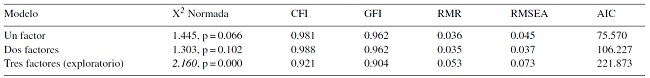 La muestra del análisis factorial confirmatorio presentó distribuciones normales, una media de 2.66 y una desviación estándar de 0.66. En la Tabla 2 se presentan los índices obtenidos de los 3 modelos analizados en el análisis factorial confirmatorio.