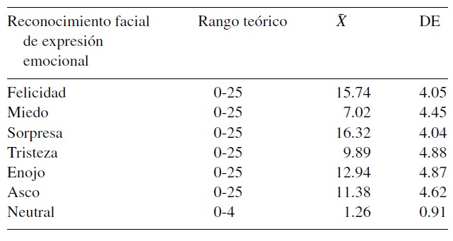 En la Tabla 1 se muestran los resultados de medias y desviaciones estándar del reconocimiento facial de expresión emocional, por cada una de las emociones evaluadas. En la Tabla 1 también se presentan los datos reportados de las 6 emociones y la expresión neutral, incluidas en el FEEST, las cuales se describen a continuación:
