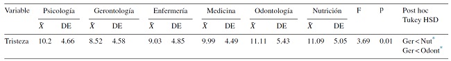 La Tabla 2 muestra los resultados de las diferencias por licenciatura en el reconocimiento facial de la tristeza. Se encontraron diferencias estadísticamente significativas F (6, 554) = 3.69, p = 0.001. Se observa que la licenciatura en Gerontología obtuvo un puntaje menor en cuanto al reconocimiento facial de la emoción tristeza ( = 8.52) en comparación con las licenciaturas en Nutrición ( = 11.10) y Odontología ( = 11.11).