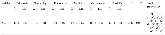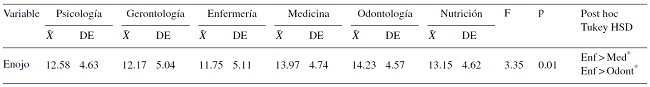 En cuanto a las diferencias por licenciatura, los resultados arrojaron diferencias estadísticamente significativas en el reconocimiento facial de la emoción tristeza, siendo los licenciados en Gerontología quienes reconocían en menor medida esta emoción. También se encontraron diferencias estadísticamente significativas en el reconocimiento facial de la emoción enojo, siendo los licenciados en Enfermería quienes reconocen en mayor media esta emoción. Por último, se encontraron diferencias estadísticamente significativas en el reconocimiento facial de la expresión asco, siendo los licenciados en Psicología, Medicina y Nutrición quienes reconocieron con mayor facilidad la emoción asco y los licenciados en Gerontología, Enfermería y Odontología quienes reconocieron con menor facilidad la emoción asco.
