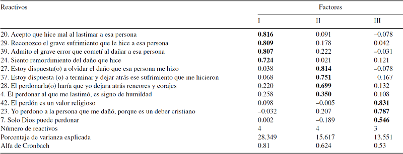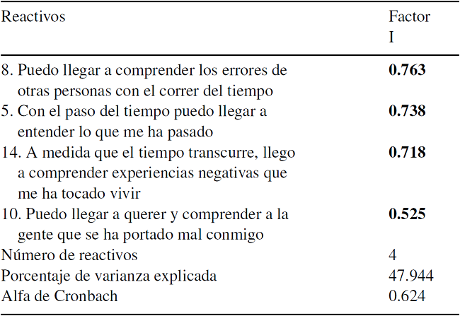 La escala mostró una configuración unidimensional de la capacidad de perdonar, cuyos reactivos no corresponden a la descripción de los factores originalmente propuestos, y el coeficiente de confiabilidad alfa de Cronbach resultó aceptable pero bajo.