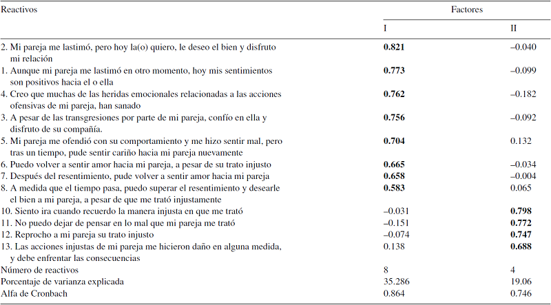 Finalmente, la estructura factorial de la Escala del Perdón en la Relación de Pareja explicó el 54.346% de la varianza y contó con una consistencia interna global de α = 0.763, lo que es relativamente aceptable. En esta muestra, la escala no quedó constituida por el mismo número de reactivos, sin embargo, se replicó la estructura bifactorial del estudio original.