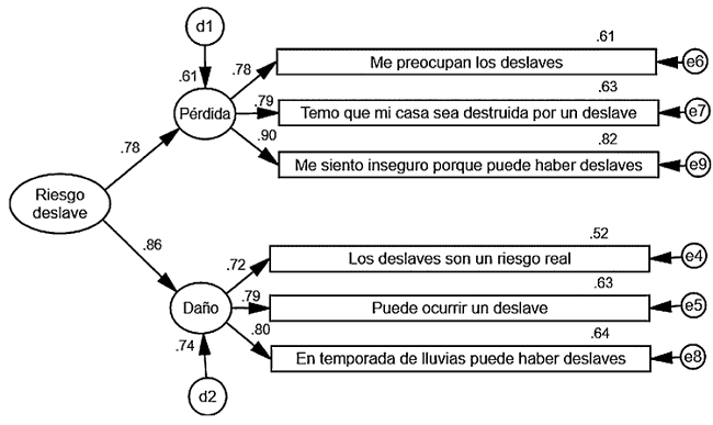 Evaluar la percepción del riesgo de deslave en comunidades urbanas situadas en áreas de riesgo implica un desafío para explicar el fenómeno; por este motivo es sumamente importante contar con pruebas psicométricas con propiedades óptimas cuya validez convergente y discriminante permita demostrar que los constructos se agrupan en factores independientes. El AFC ratificó estos resultados, es decir, las pruebas de significación permiten determinar la validez de constructo mediante la especificación de los factores latentes.