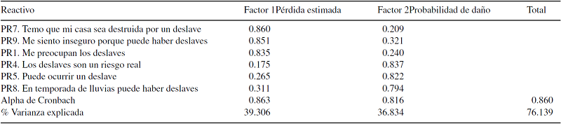 El factor 1, denominado «pérdida estimada», cuenta con 3 reactivos con confiabilidad alta (α = 0.863), que explica el 39.306% de la varianza. El factor evalúa la probabilidad que las personas asignan de perder bienes materiales y la seguridad de mantenerse a salvo ante un deslave.