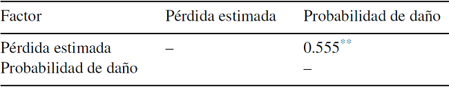 Es de resaltar que las cargas factoriales se ajustan con nitidez; en el primer factor del modelo se aprecia que la variable latente «Pérdida» está relacionada con cada uno de los indicadores cuyas cargas factoriales son altas (van de 0.78 a 0.90); para la segunda variable latente, «Daño» (probabilidad de daño), se aprecian de igual manera una relación con cargas altas (van de 0.72 a 0.80).
