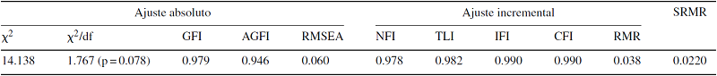 Se realizó el análisis factorial confirmatorio (AFC) con el paquete estadístico SPSS AMOS versión 22. El objetivo fue determinar la validez de constructo del instrumento (Hair, Anderson, Tatham y Black, 1999). Para la estimación del ajuste del modelo se consideraron los siguientes estadísticos de bondad: chi-cuadrado (χ2) y chi-cuadrado ajustada (χ2/df), índice de bondad de ajuste (GFI), índice de bondad de ajuste corregido (AGFI), índice de ajuste comparativo (CFI), índice de ajuste normalizado (NFI) e índice Tucker-Lewis (TLI) que entre más próximos a 1 existe un buen ajuste del modelo (Brown, 2006; Hair et al., 1999), así como raíz cuadrada media del error de la aproximación (RMSEA) y residuo cuadrático promedio estandarizado (SRMR).