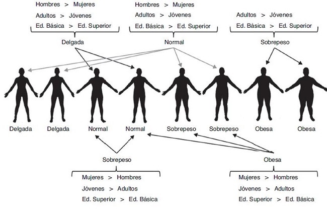El que las mujeres, los jóvenes y los participantes con educación superior tiendan a juzgar la talla de otros como más gruesa que la que establece el IMC es congruente con que actualmente en las culturas occidentales la familia, los amigos, los medios masivos de comunicación y el público en general presionan a las mujeres, a los jóvenes y a las personas con educación superior a apreciar las tallas delgadas en mayor grado que las tallas más gruesas (e.g., Allison et al., 2006; O’Dea, 2008; Pruis y Janowsky, 2010). Los resultados también coinciden con que en las culturas occidentales los integrantes de los subgrupos mencionados antes están sujetos en mayor grado que sus contrapartes a presiones sociales para adherirse a la talla culturalmente aceptada como la ideal (e.g., McCabe y Ricciardelli, 2003; O’Dea, 2008; Pruis y Janowsky, 2010). Dichas presiones repercuten en la precisión con la que las personas estiman la talla corporal de un tercero. Mientras que ciertas personas (hombres, personas jóvenes y personas con educación básica) tenderán a subestimar la talla corporal de terceros, otros individuos (mujeres, personas adultas y personas con educación superior) tenderán a sobreestimarla. Por tanto, la definición de delgadez, de talla normal, de sobrepeso y de obesidad difiere en función del grupo social al que se pertenece.