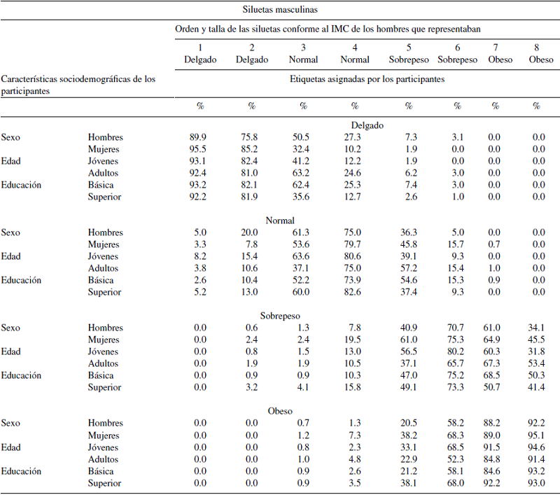 Relativo a las siluetas masculinas (Fig. 1), se encontró que los hombres (D = 0.18, X 2 (2) = 8.32, p < 0.02), los participantes adultos (D = 0.227, X 2 (2) = 14.0, p < 0.001) y los participantes que tenían educación básica (D = 0.264, X 2 (2) = 18.95, p < 0.001) asignaron confiablemente en mayor grado que sus contrapartes la etiqueta de delgado a siluetas que representaban a hombres de talla normal y con sobrepeso. Los participantes adultos (D = 0.181, X 2 (2) = 8.84, p < 0.02) y los participantes con educación básica (D = 0.174, X 2 (2) = 8.23, p < 0.02) consideraron como de talla normal a hombres que tenían sobrepeso. Los adultos (D = 0.211, X 2 (2) = 12.03, p < 0.01) y los participantes con educación básica (D = 0.175, X 2 (2) = 8.29, p < 0.02) asignaron la etiqueta de sobrepeso a siluetas que representaban a hombres obesos. Por su parte, las mujeres (D = 0.18, X 2 (2) = 8.09, p < 0.02), los participantes jóvenes (D = 0.168, X 2 (2) = 7.62, p < 0.05) y los que tenían una educación superior (D = 0.166, X 2 (2) = 7.53, p< 0.05) asignaron en mayor grado que sus contrapartes la etiqueta de obeso al segundo hombre de talla normal y a los dos con sobrepeso.