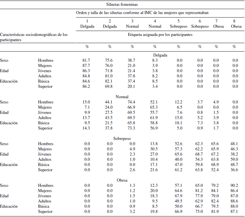 Los resultados del presente estudio mostraron también que proporciones relativamente altas (i.e., hasta un 57%) de participantes asignaron las etiquetas de delgado y de talla normal a siluetas masculinas que representaban a hombres con sobrepeso y obesos. En cambio, en el caso de las siluetas femeninas, ningún participante asignó la etiqueta de delgada a siluetas que representaban a mujeres con sobrepeso u obesas, y porcentajes relativamente pequeños (i.e., máximo un 18%) asignaron la etiqueta de normal a mujeres con sobrepeso. Este hallazgo mostró que las definiciones de talla son más estrictas en el caso de las mujeres que en el caso de los hombres. Esto es congruente con que el cuerpo femenino está sujeto con más frecuencia al escrutinio público que el cuerpo masculino (cf. Grogan, 2008).