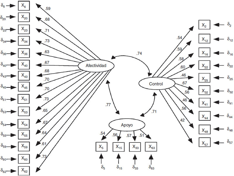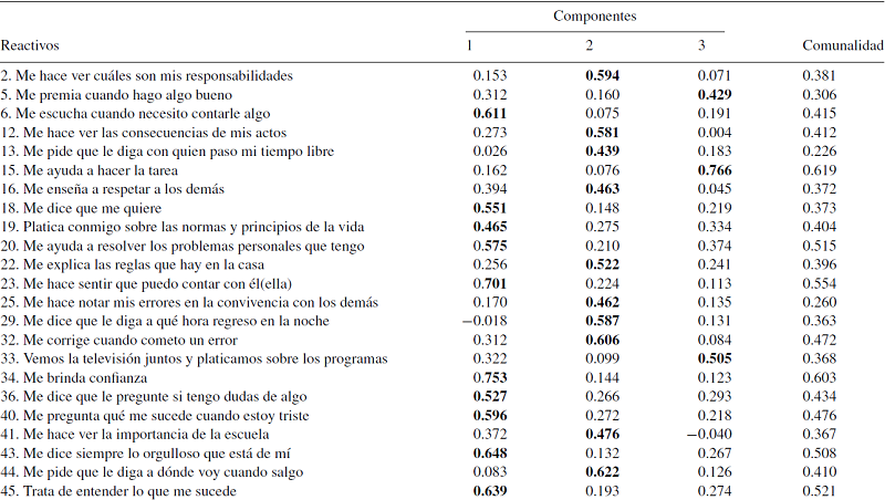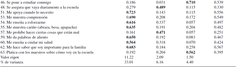 Se llevó a cabo un primer análisis factorial exploratorio con una rotación de tipo ortogonal (varimax) y con extracción de componentes principales; dicho análisis se consideró pertinente dado que se requería maximizar la varianza extraída para cada factor, además de que la rotación oblicua no se justificaba dado que las correlaciones ítem-ítem no superaban el 0.70. Los resultados mostraron un índice de adecuación del muestreo Kaiser-Meyer y Olkin KMO = 0.958 y en el test de esfericidad de Bartlet X 2 = 15,726.4; p = 0.000, siendo ambos satisfactorios, y en donde los reactivos se agruparon en 9 factores cuyos autovalores fueron mayores que uno, explicando en su conjunto el 54.19% de la varianza total acumulada; sin embargo, solo el primer factor explicaba el 28.98% de la varianza, mientras que los siguientes factores disminuían significativamente en su porcentaje. Con base en el criterio del punto de quiebre de Cattell, se observó que una solución a tres dimensiones sería suficiente para explicar la variabilidad registrada al interior de los datos, por lo que se decidió llevar a cabo una rotación forzada a tres dimensiones. A partir de la solución identificada, se eliminan reactivos que no mostraban una comunalidad mínima de 0.30, así como que no tenían pesos factoriales mayores de 0.40 (Comrey y Lee, 2009). Finalmente, la solución a tres dimensiones explicó un 43.6% de la varianza y conceptualmente era coincidente con la literatura científica. De tal manera que la escala quedó conformada por 34 reactivos, de acuerdo con los tres factores denominados: (1) afectividad, (2) control y (3) apoyo. Estos factores se observan en la Tabla 1, denotándose que el primer factor es el más importante con un autovalor 5 veces más grande que el segundo y el tercero.