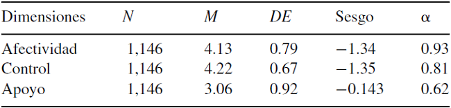 En la Tabla 2, se observa que las dos primeras dimensiones tienen índices de consistencia interna satisfactorios (a = 0.93 y a = 0.81), mientras que la tercera dimensión muestra una consistencia moderada (a = 0.62); sin embargo, todos los ítems contribuyen a la consistencia interna de la escala de la que forman parte y la eliminación de alguno de los reactivos no implica un incremento del alfa de Cronbach de la escala. En términos de sesgo se puede ver que se tiene una asimetría negativa, la cual es mayor en los dos primeros factores.