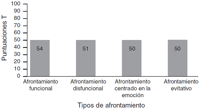 Con el fin de poder llevar a cabo las comparaciones de las frecuencias de las estrategias de afrontamiento que empleaban los niños en edad escolar, en primer lugar se realizó la transformación de las puntuaciones naturales a calificaciones estandarizadas (puntuaciones T). De esta forma se encontró que el tipo de estrategia que emplearon los niños con mayor frecuencia fue el afrontamiento funcional, que incluye las estrategias de negociación, autocrítica, autosuficiencia, resolución de problemas, adaptación y búsqueda de apoyo. Seguido por el afrontamiento disfuncional, que incluye las estrategias de enojo, autoagresión, oposición, aislamiento social o retraimiento. Posteriormente, se encontró el afrontamiento centrado en la emoción, que incluye las estrategias de tristeza y miedo. Y finalmente, el afrontamiento evitativo, conformado por las estrategias de distracción y evitación (Fig. 1).