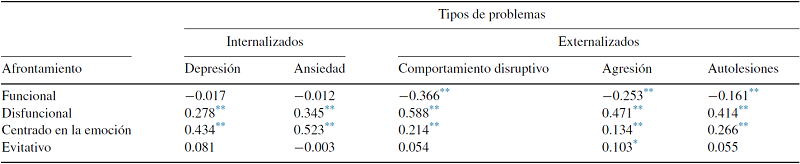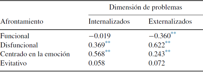 En resumen, se puede observar que el tipo de afrontamiento se asocia con los problemas internalizados y externalizados de los niños: a mayor empleo de estrategias de afrontamiento funcional, menor expresión de problemas externalizados, mientras que a mayor empleo de estrategias de tipo disfuncional y centrado en la emoción, mayor presencia de problemas tanto internalizados como externalizados (Tabla 2).