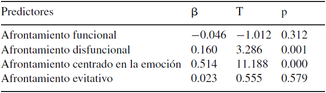 Por otro lado, en cuanto a la dimensión de problemas externalizados, también se obtuvo un modelo adecuado (F(4,389) = 71.73; p = 0.001), con una R2 = 0.42; el tipo de afrontamiento que más explicó este tipo de problemas fue el afrontamiento disfuncional, seguido de manera negativa por el afrontamiento funcional (Tabla 4).