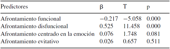 Así mismo, los resultados indicaron que el afrontamiento centrado en la emoción fue el que explicó en mayor medida los problemas internalizados, mientras que el afrontamiento disfuncional explicó en mayor medida los problemas externalizados.