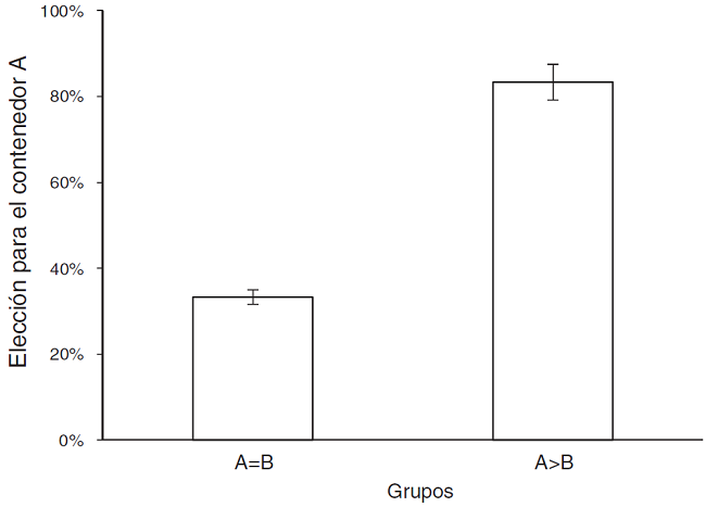 Los resultados obtenidos muestran que la elección de los niños varía de acuerdo con el valor de la magnitud de las monedas. El grupo A = B eligió más el último contenedor B, mientras que en el grupo A > B se eligió más el contendor A. La Figura 1 muestra la gráfica con el porcentaje de la elección para el contendor A, en el cual varió la magnitud de la consecuencia de acuerdo a cada grupo. La gráfica muestra la elección del contendor A, la cual fue del 33% para el grupo A = B, mientras que para el grupo A > B fue del 83%. Para confirmar la diferencia entre la elección del contenedor A de ambos grupos se realizó una prueba t(22) = 2.7595, p = 0.0114, que mostró diferencias significativas entre el grupo A = B y A > B. La magnitud del efecto se calculó a través de un coeficiente de correlación r: 0507, que reveló que el tamaño del efecto fue alto, lo que permite sugerir con mayor certeza que la magnitud de la consecuencia influyó en la elección al contenedor A. Como se puede observar en la Figura 1, una menor elección del contenedor A en el grupo A = B refleja que cuando ambas experiencias tienen igual magnitud de la consecuencia, se pondera la experiencia más reciente, que es el contenedor B. Mientras que en el grupo A > B, después del paso del tiempo, se pondera la magnitud de la consecuencia al elegir más el contenedor A.